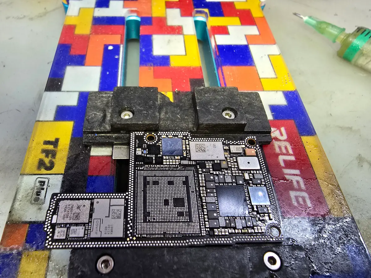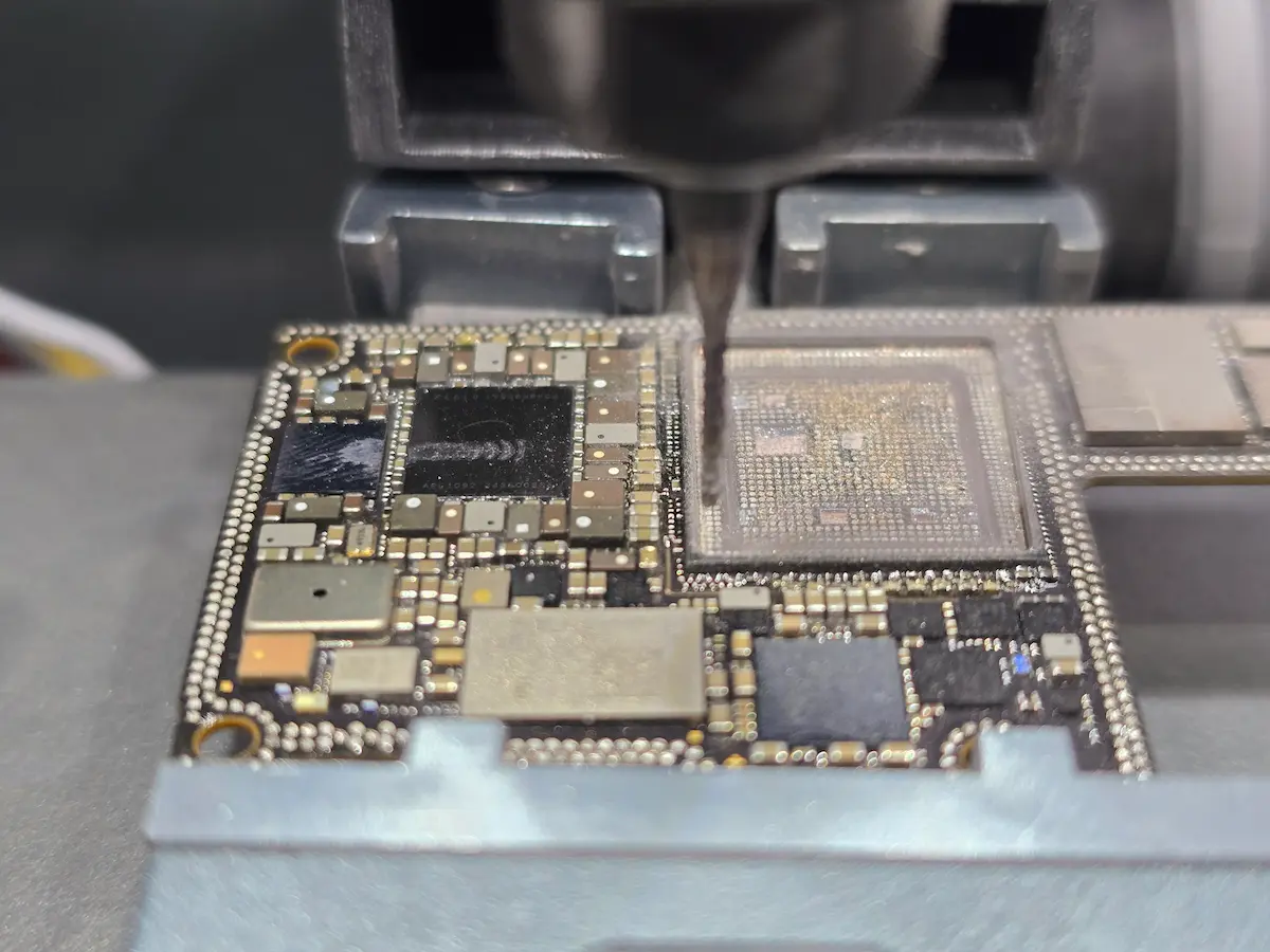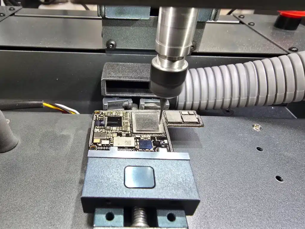 Ultima etapă a presupus curățarea și rebilarea (refacerea bilelor de contact) procesorului original, a memoriei NAND și a EEPROM-ului. După sudarea acestor piese pe placa pregătită prin CNC, am reasamblat straturile plăcii de bază. Rezultatul? Telefonul a pornit, iar toate datele clientului au fost recuperate integral din „epava” inițială.