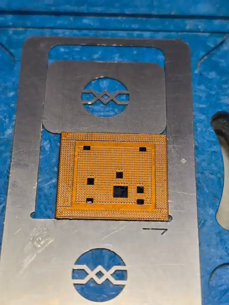 Pentru a asigura succesul operațiunii, am folosit o mașină specială de tip CNC. Această tehnologie ne-a permis să tăiem procesorul vechi de pe placa donatoare cu o precizie chirurgicală, fără a stresa termic restul circuitelor. Este un proces mult mai sigur decât metodele clasice de deslipire, garantând integritatea noii „case” pentru componentele originale